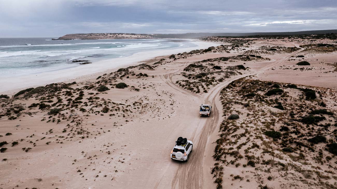 The cars themselves took some serious punishment during the trip. The crew covered huge distances between surf spots, traveling upwards of 6 hours each day, on highways, down dusty bush tracks, over dunes and through soft beach sand (even if waivers had been signed voiding any insurance for off-road driving). Uncle Mick took the helm most often, putting his 4WD skills to good use, getting the car out of some tight situations, using seaweed coverage to avoid getting bogged too badly.